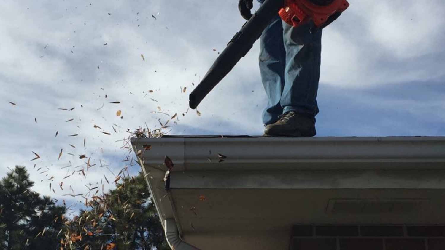 Leaves and debris are cleared from gutters and downspouts to prevent clogs, water damage, and ice buildup during winter.